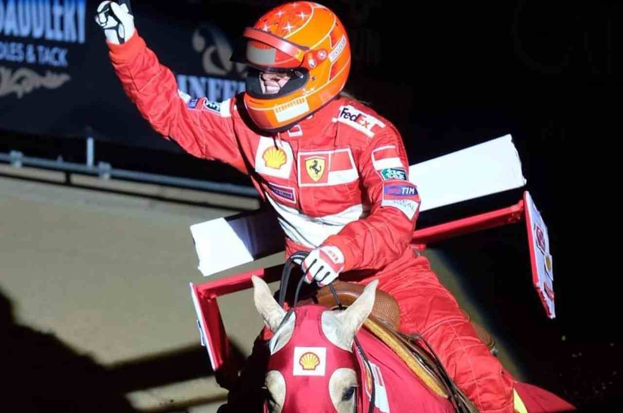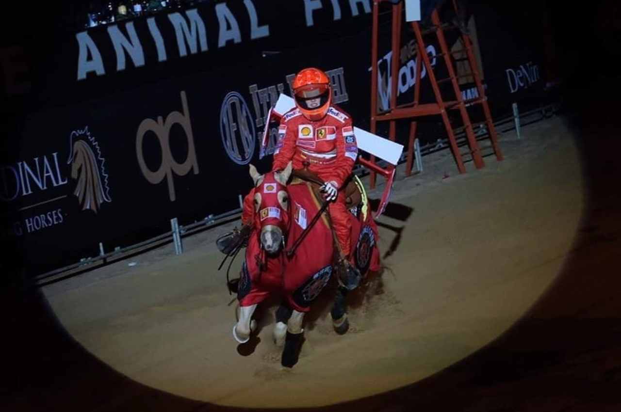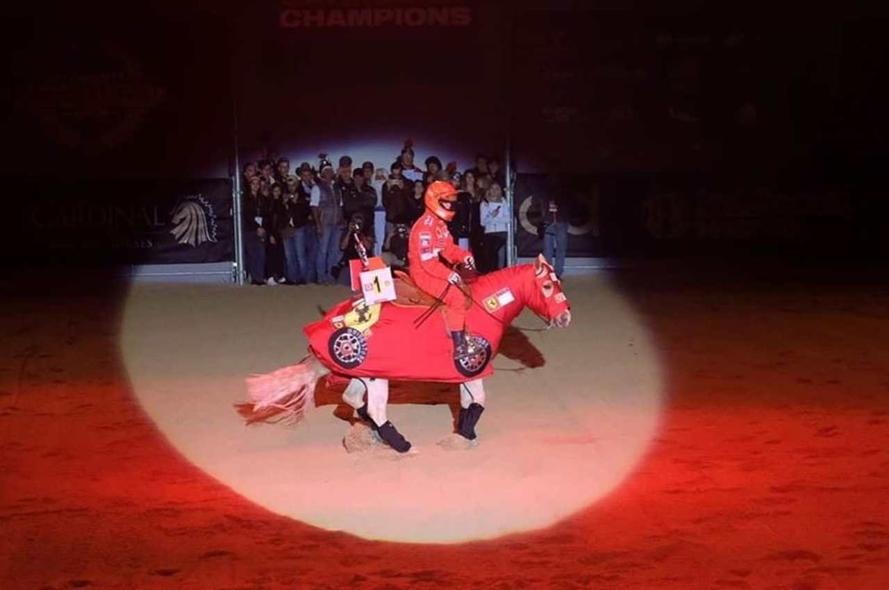 Durante la Fieracavalli di Verona, Gina Maria Schumacher ha deciso di esibirsi completamente in rosso: casco, tuta Ferrari e costumi anche per il cavallo, per rendere omaggio a quanto realizzato da suo padre in Formula 1.